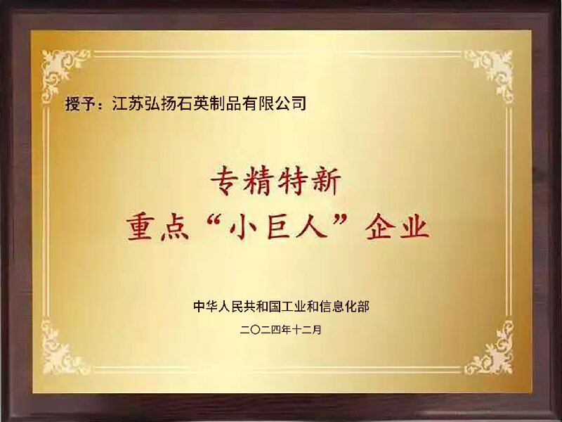 江蘇弘揚石英制品有限公司創建于2004年,是一家集石英材料研發、生產、銷售于一體的科技型企業。公司產品主要有:高純度石英砂,石英管、石英棒、石英板,石英擴散管、石英舟、石英舟托等石英器件,主要應用于光源、光伏、半導體、激光、航空航天等領域。弘揚石英專注產品開發,憑借一體化的全產業鏈優勢、行業領先的高質量產品,與上下游龍頭企業建立長期穩定的合作關系,公司是國家專精特新小巨人企業、國家知識產權優勢企業、國家知識產權示范企業、國家高新技術企業、全國創新型中小企業、省科技型企業、省創新能力示范企業、省民營科技企業、省質量誠信5A級品牌企業、省兩化融合管理體系貫標試點企業 。先后獲中國“科技創業貢獻獎”、“全國科技創新型企業”等榮譽。